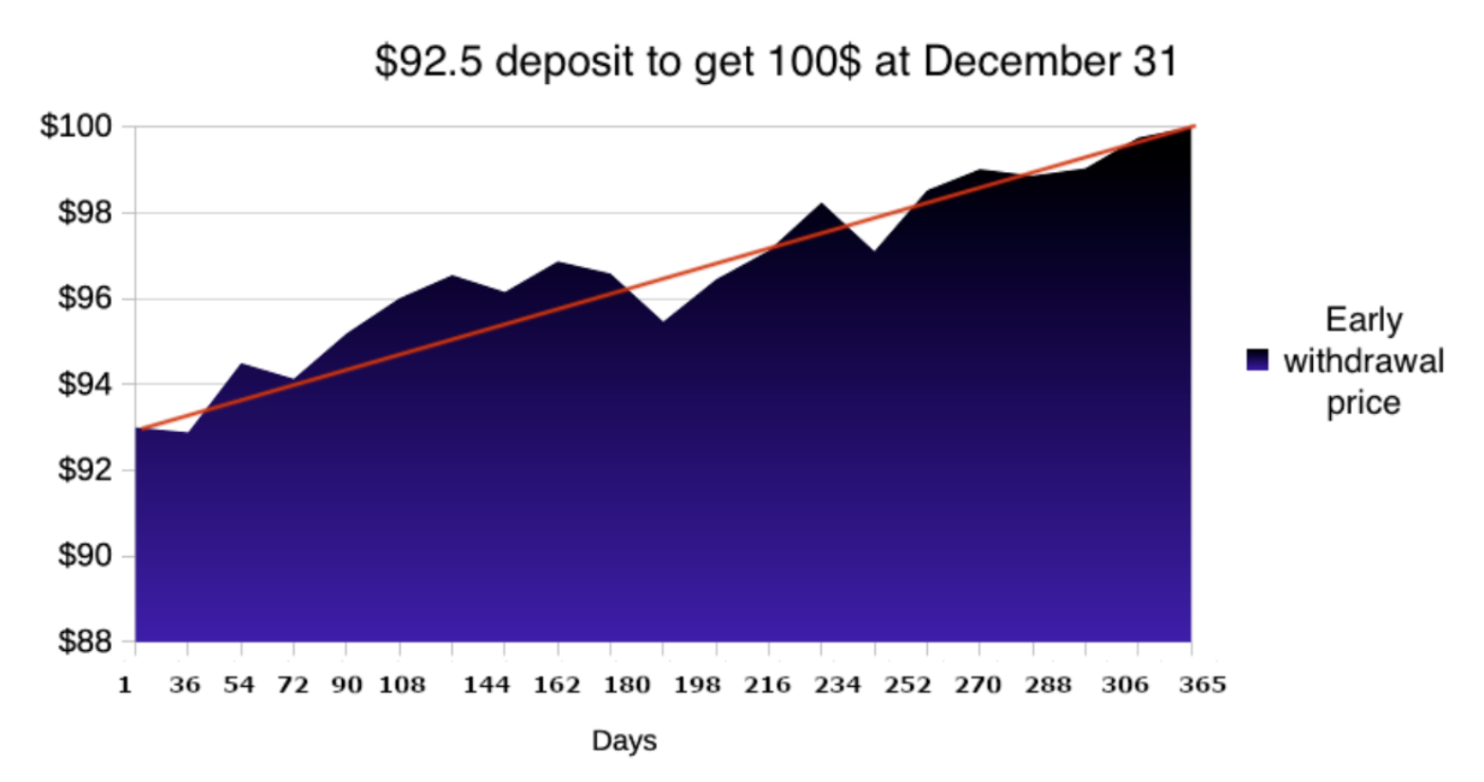 1 січня ви вклали $92.50 у FIVA, щоб отримати $100 до кінця року. Графік показує, скільки ви отримали при виведенні в різні дні. Хоча загальна тенденція — зростання до $100 у міру наближення до дати закінчення, на графіку видно локальні коливання — це відображає реакцію ринку на очікувану прибутковість терміну, що залишився.