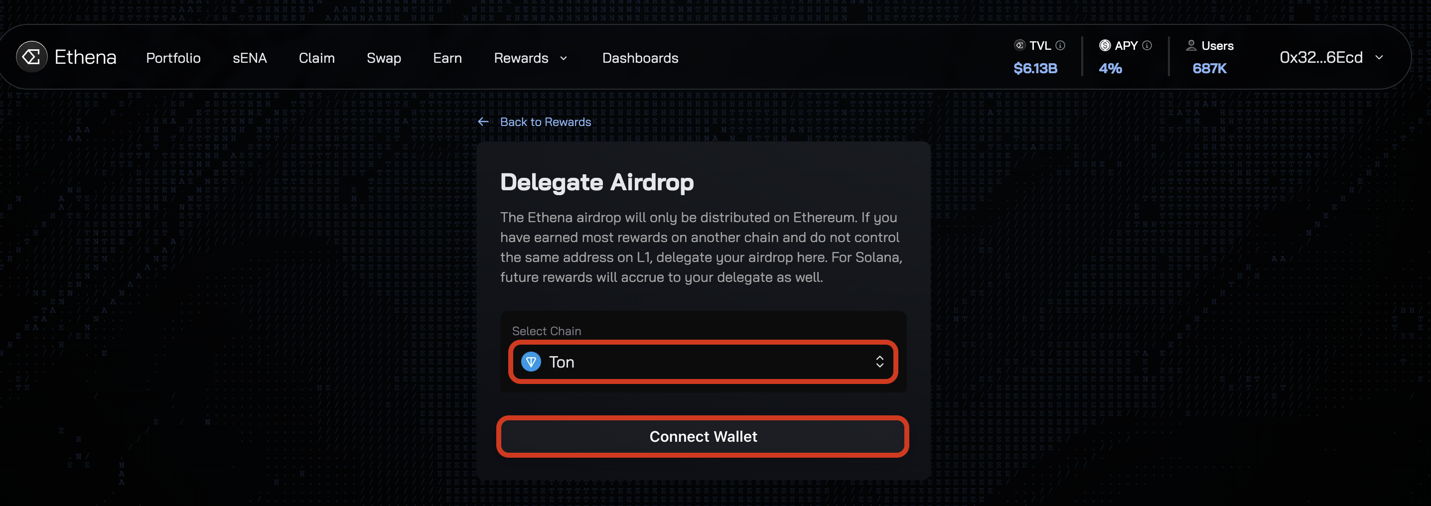 This delegation step is critical because Ethena distributes rewards on Ethereum mainnet, not on TON. Without completing this process, you won't receive your earned points despite holding YT tokens.