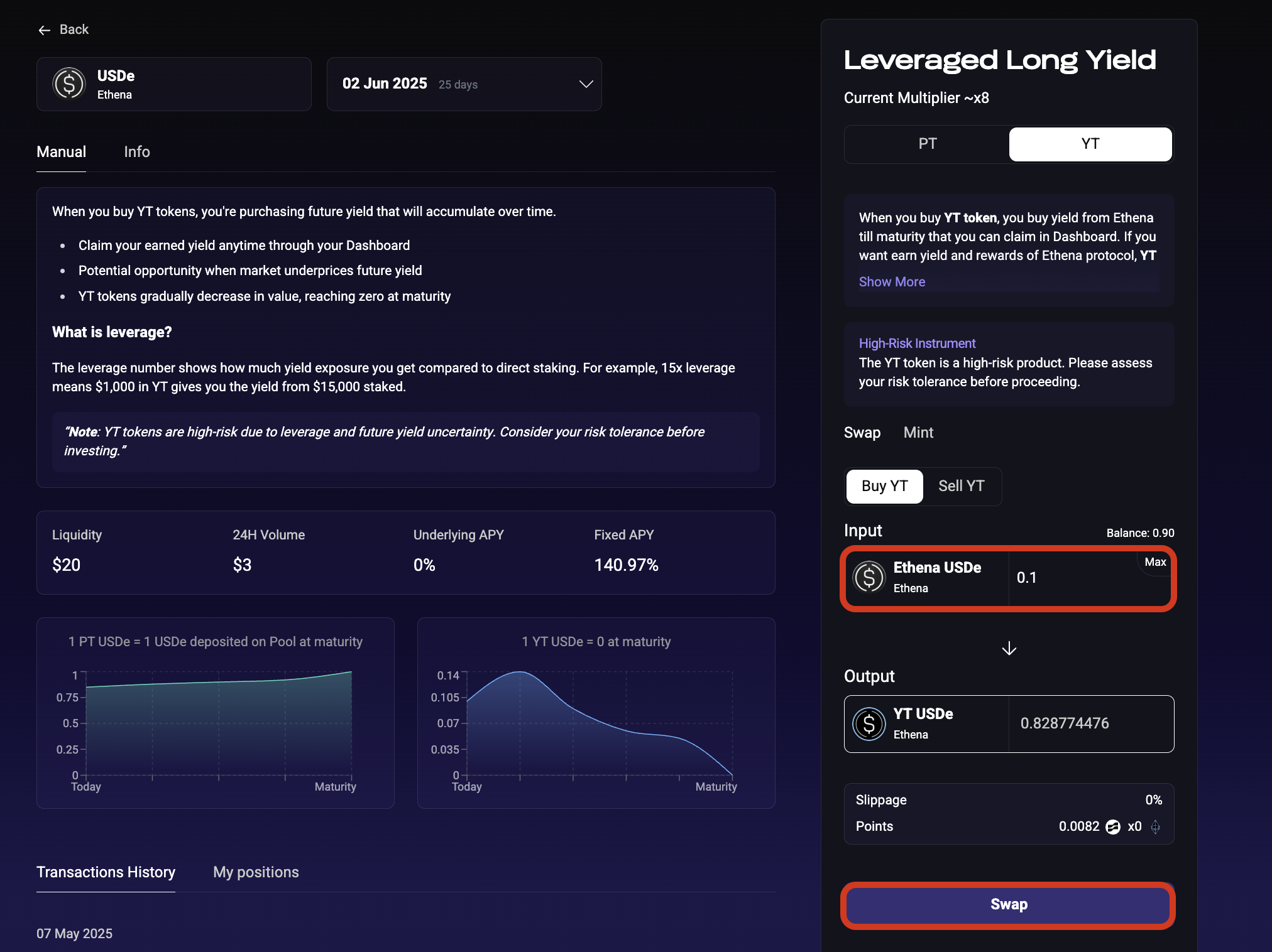 YT Ethena USDe tokens represent a highly capital-efficient way to accumulate Ethena points. By combining our exclusive 60x partnership multiplier with the capital efficiency of only paying for yield rights, YT tokens allow you to maximize your point accumulation with minimal capital commitment.