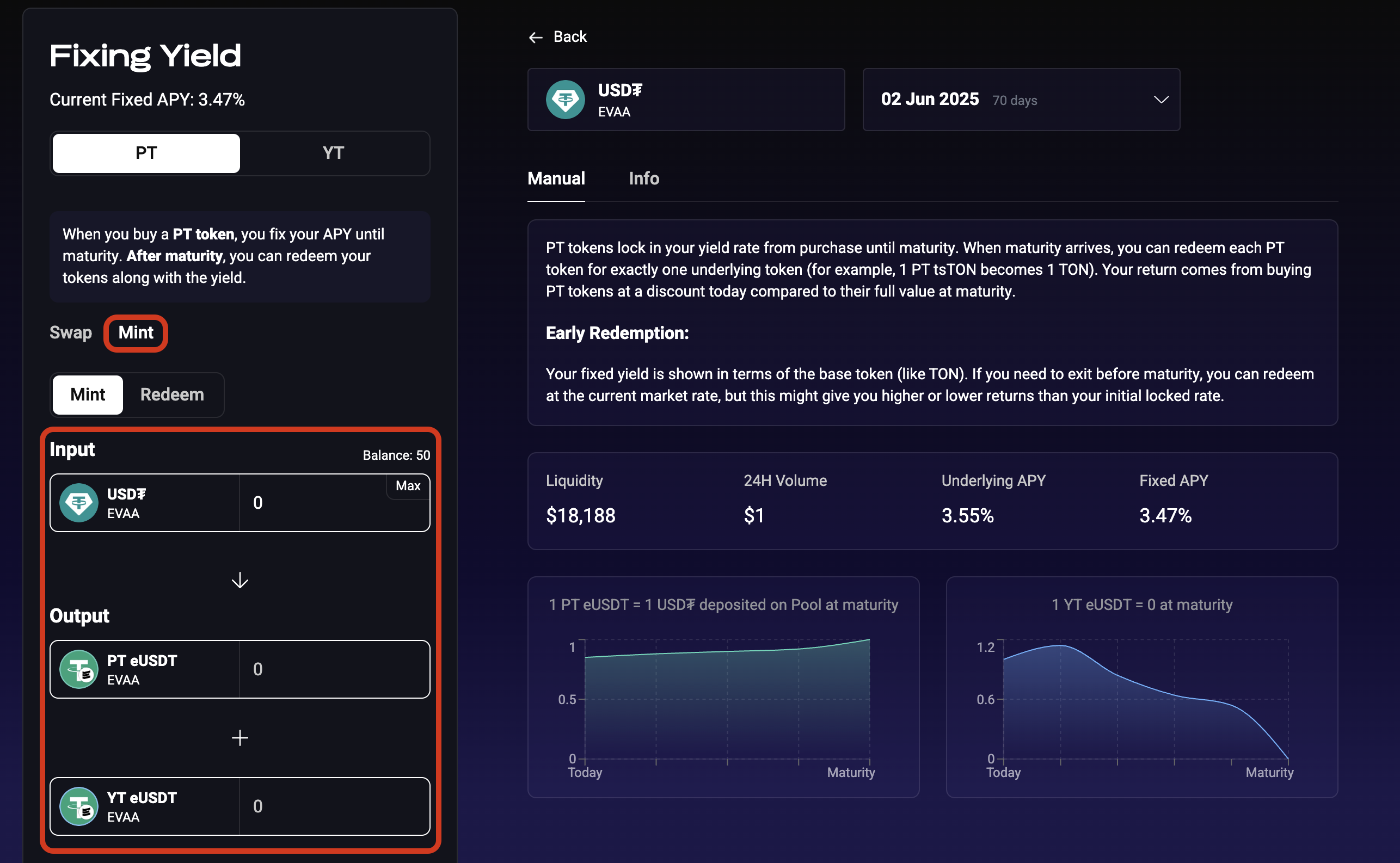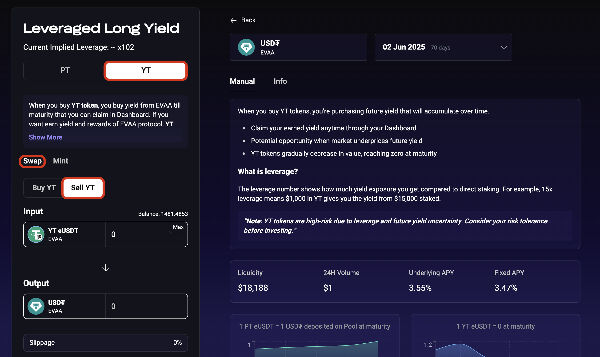 For example, if you hold 100,000 USDT in EVAA earning 7% APY, you're set to earn 7,000 USDT over the year. Instead of waiting, you can access a significant portion of this future yield right now by minting and selling YT tokens, while keeping your principal secure in PT tokens.