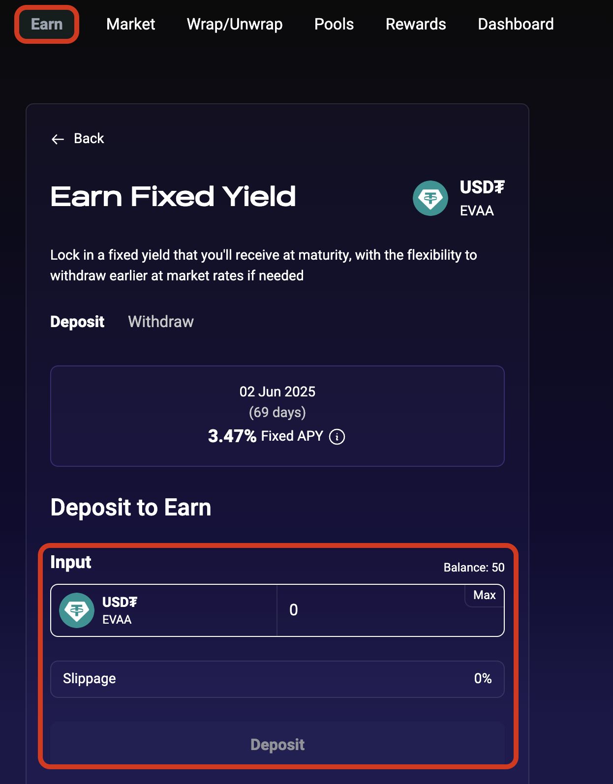 You can establish a fixed-yield position on EVAA in two ways: