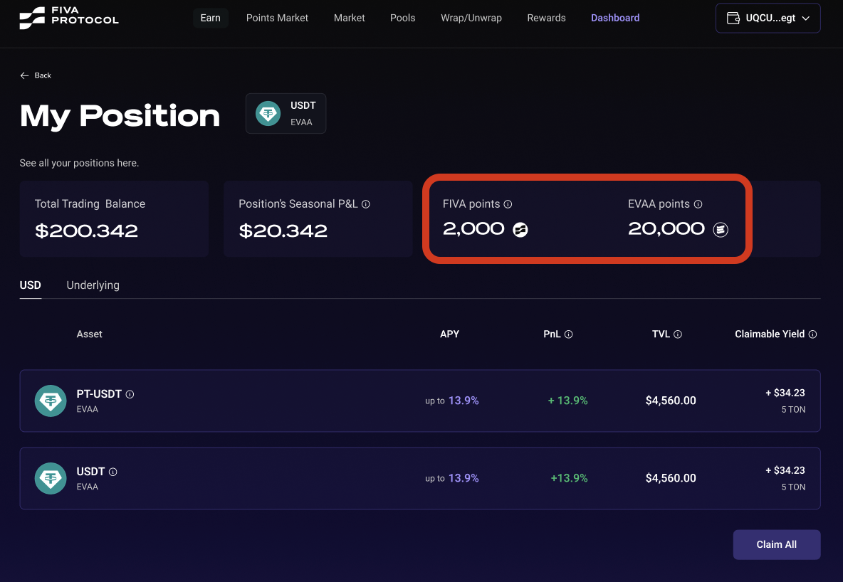 FIVA's YT tokens for EVAA USDT provide extraordinary capital efficiency for farming EVAA points, thanks to our exclusive partnership arrangement. With multipliers potentially reaching up to 270x depending on market conditions, it's currently the most efficient way to farm EVAA points on TON.
